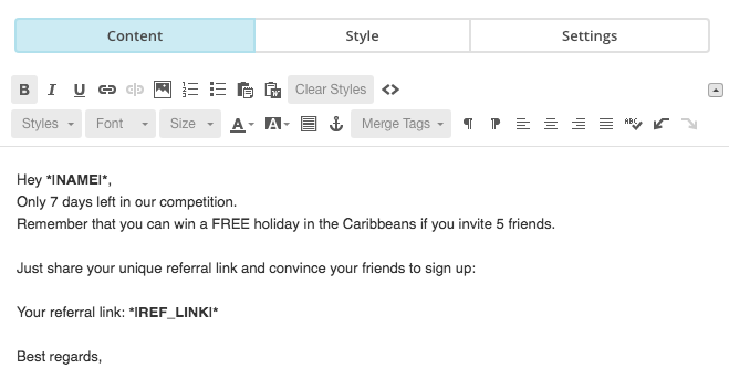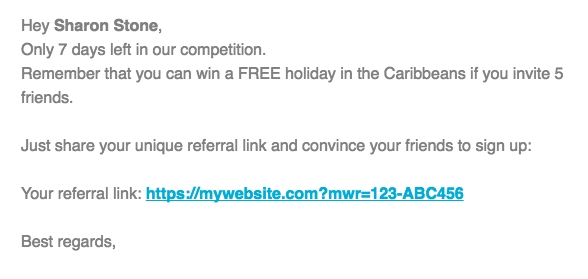 Assuming you are importing all ReferralHero custom fields as described above, let's say you want to send out a newsletter where you remind your subscribers about your referral program and to keep sharing their code.