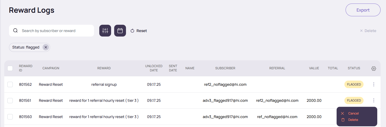 * Referral’s reward is restored to its original status (*Pending* or *Send immediately*)