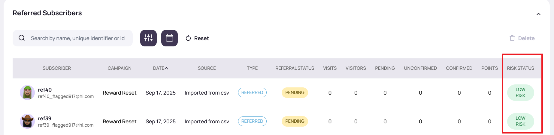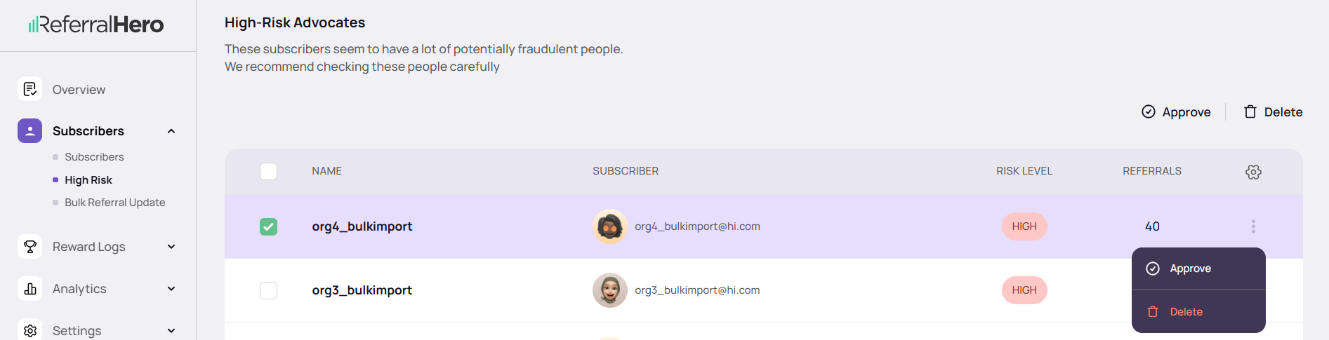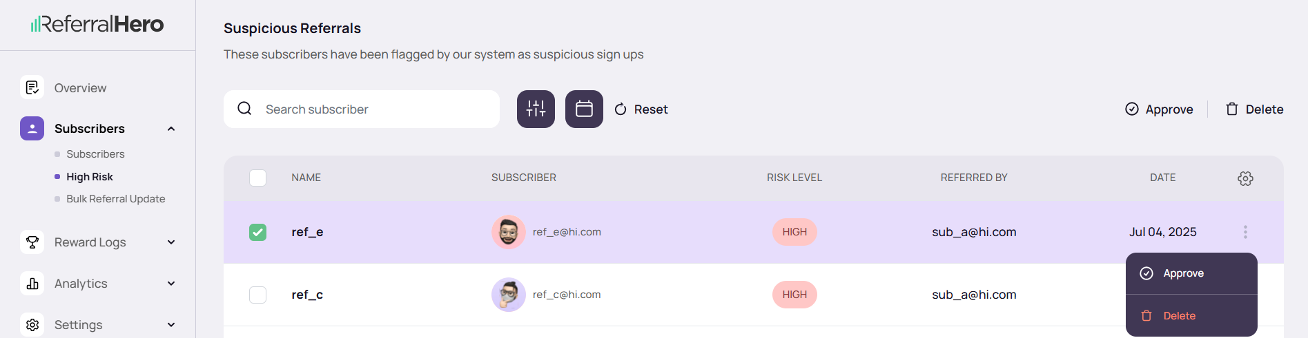 ReferralHero is committed to maintaining the integrity of its referral program by preventing fraudulent activities and ensuring that referred subscribers are high quality. This page explains how high-risk subscribers are identified, what happens when they are flagged, and how the approval process affects rewards, automations, and analytics.