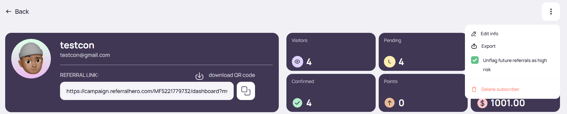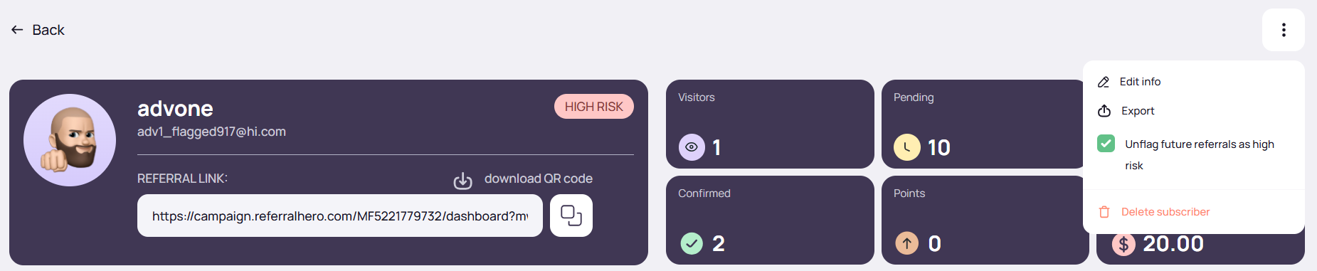 In this scenario, we explore the prospect that a subscriber has referred individuals displaying characteristics or behaviors associated with high risk. This may encompass patterns of suspicious activity or irregular signup information. ReferralHero actively monitors such cases to safeguard the overall integrity of the referral program.