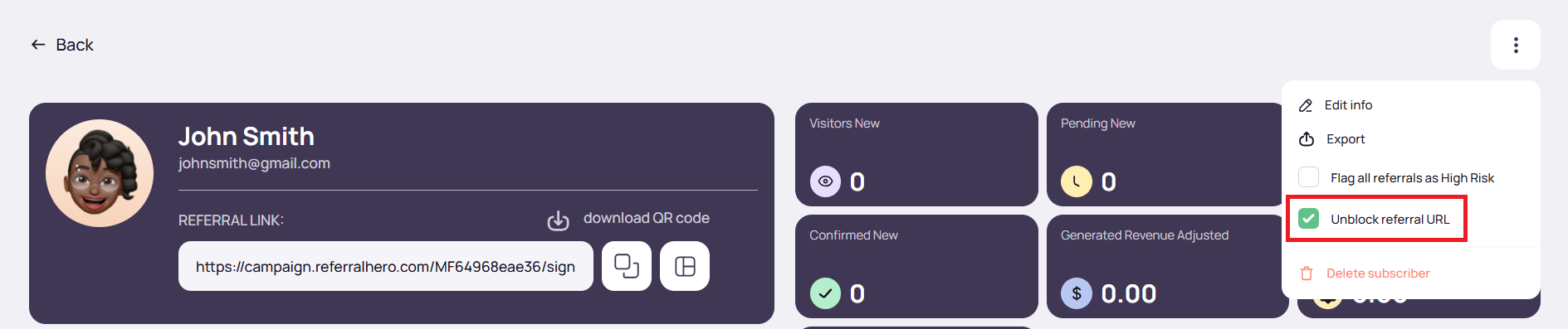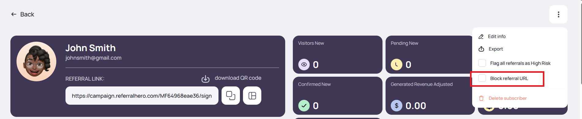 When a subscriber is blocked, their referral URL is fully disabled. This prevents any new referrals, rewards, or payouts from being generated, while preserving the subscriber record for audit and investigation purposes.