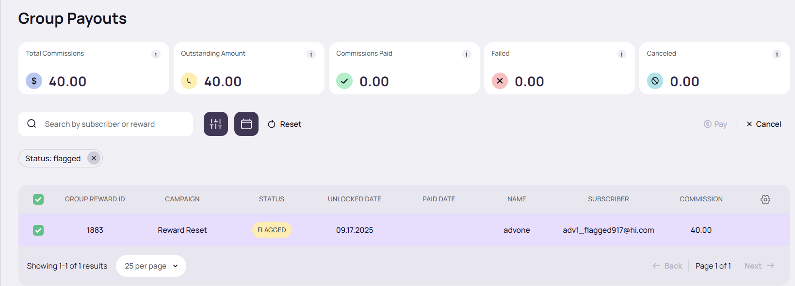 * If one or more rewards in the group are flagged, the Group Reward status shows as *Flagged*