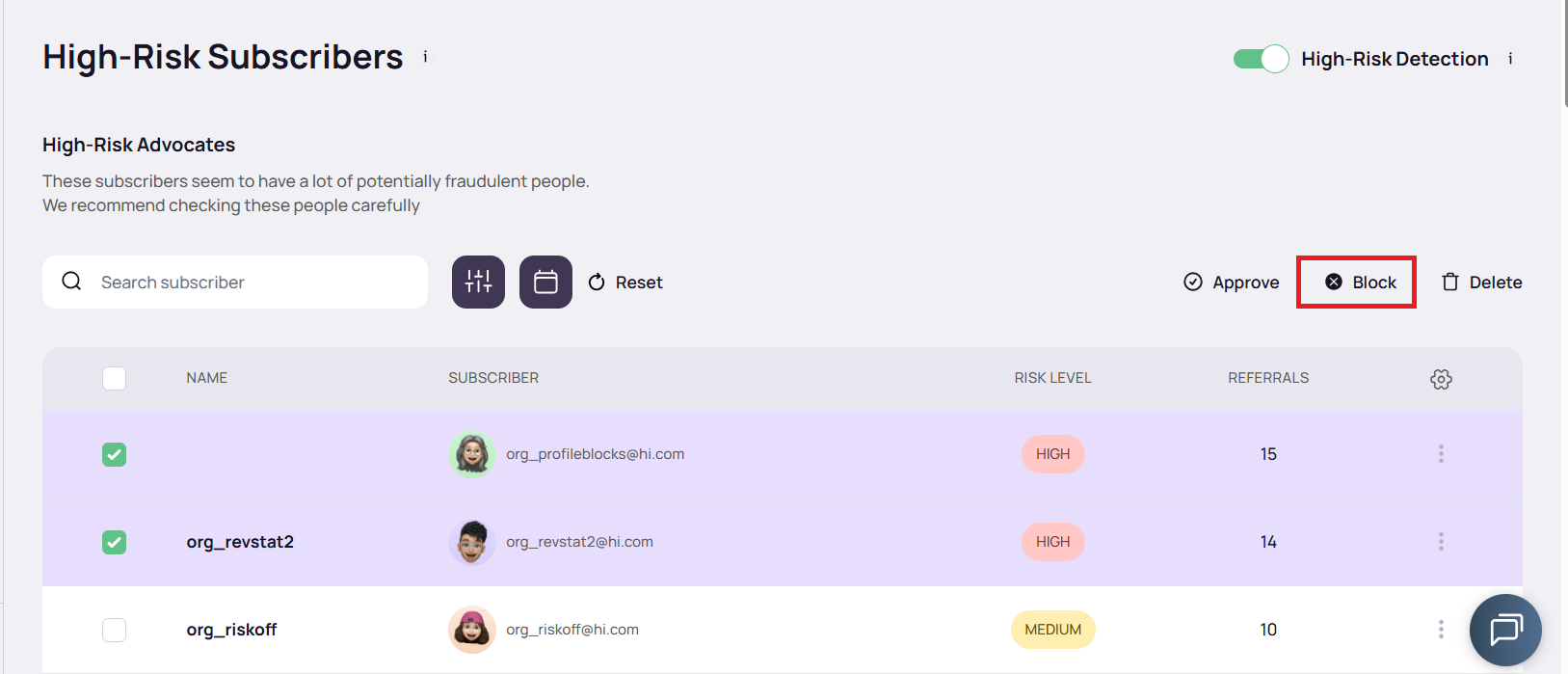 Medium-risk subscribers display more noticeable irregularities, such as unusual sign-up timing, mismatched details, or clusters of referrals that don’t look organic. These cases call for manual review, verification steps (like email or phone number confirmation), or a quick check-in with the subscriber.