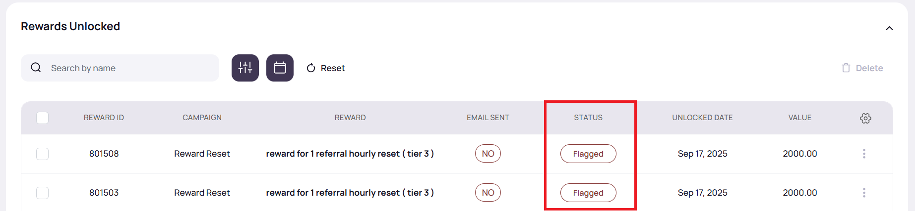 * *Flagged* limits rewards and enables review, but still allows referral activity to continue
