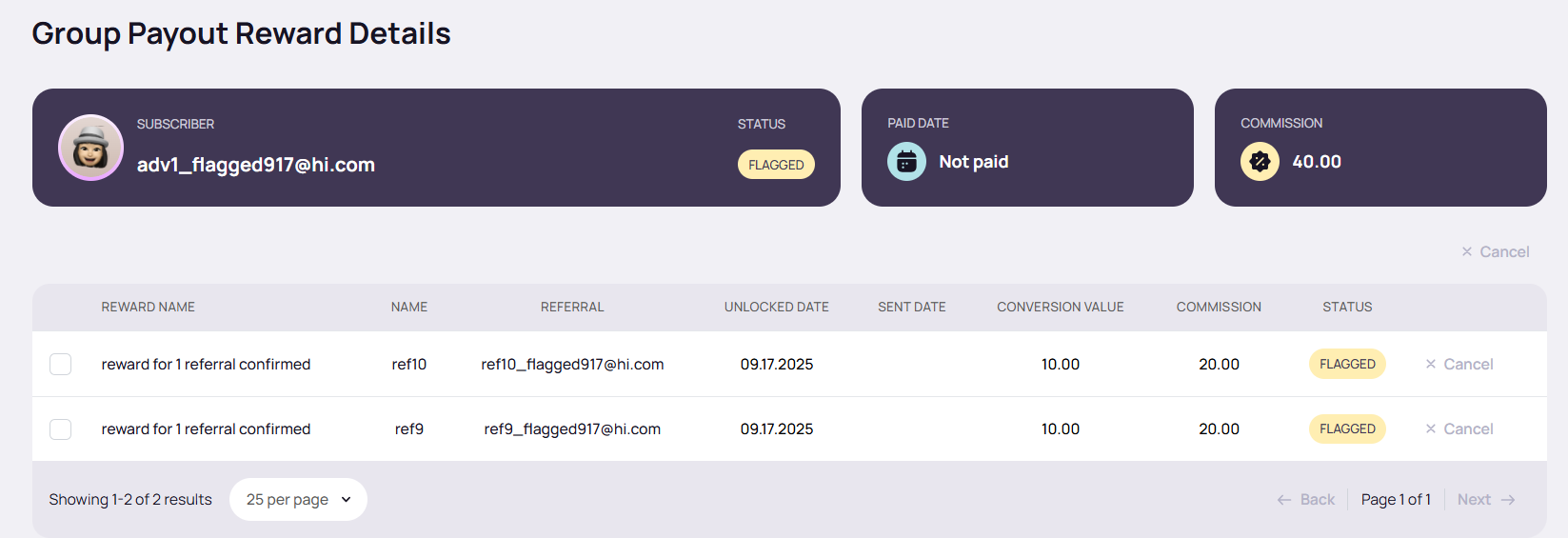 | **Approved**   | <p>- Risk status cleared<br>- “Flag all referrals as high risk” checkbox = OFF<br>- Timeline shows admin approval</p>                        | <p>- All referrals cleared of risk<br>- Future referrals behave normally</p>        | <p>- All flagged rewards revert to <em>Pending</em> or <em>Send immediately</em><br>- Future rewards behave normally<br>- Advocate not re-flagged by auto risk check</p> | - All automations run as normal                                        | Still counted in all analytics, leaderboard, and position data |