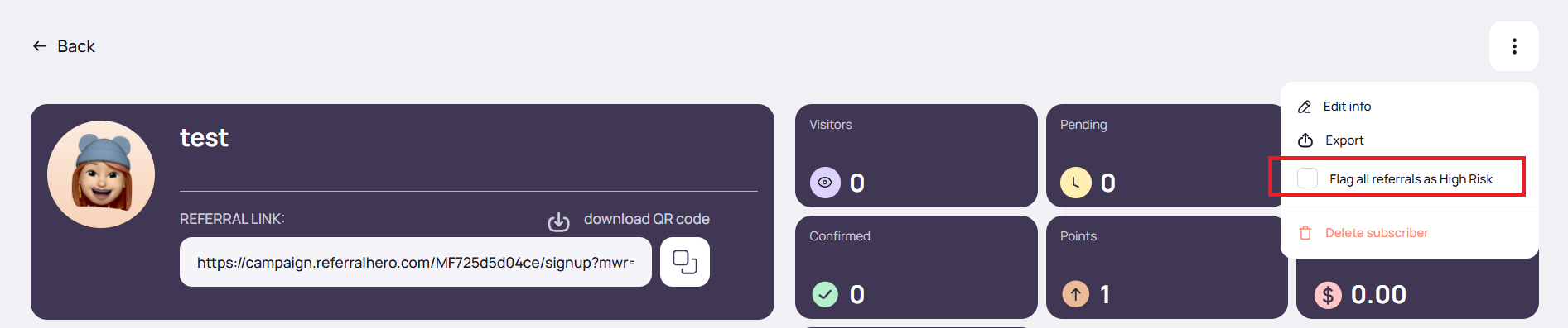 2. **Manually** – Admins can enable **“Flag all referrals as high risk”** from a subscriber profile. To do this, go to the subscriber profile, click the three-dot menu in the top right, and select **“Flag all referrals as high risk”**