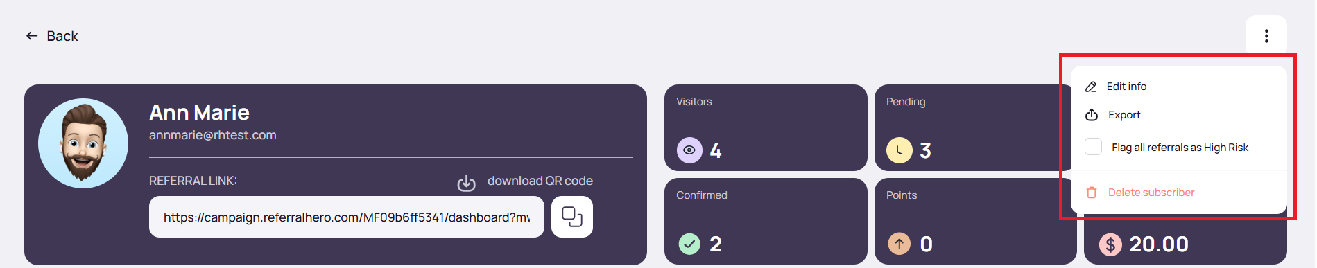 Each subscriber in your campaign has a profile page that tracks their activity, personal details, and eligibility for rewards. Profiles are automatically created when a person signs up (organically or via referral) and updated in real time as they engage with your campaign.