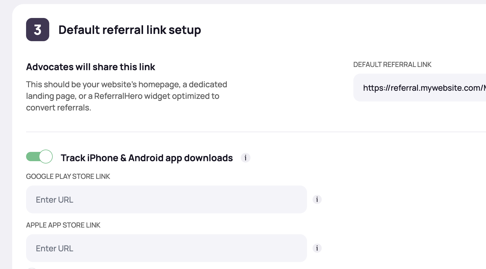 * Before using the **universal link**, the **Track iPhone & Android App Downloads** toggle must be **enabled** in the settings