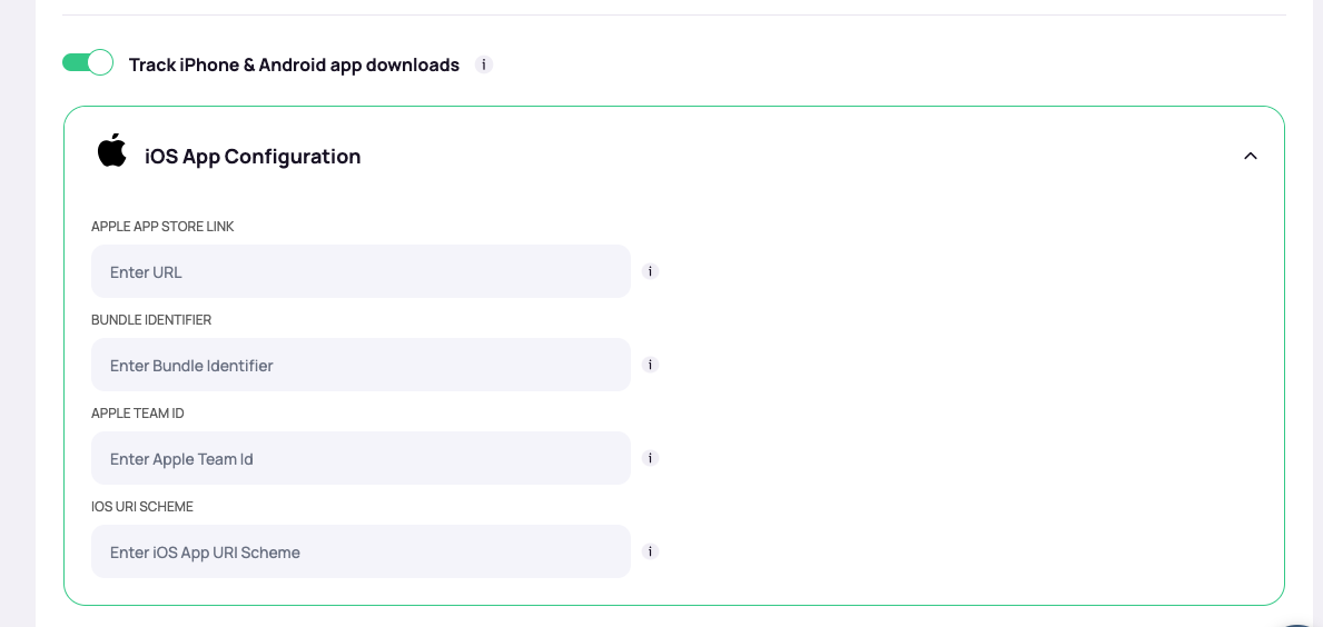 In the dashboard, add valid App Store and Google Play Store links under the **"Track iPhone & Android App Downloads"** section.